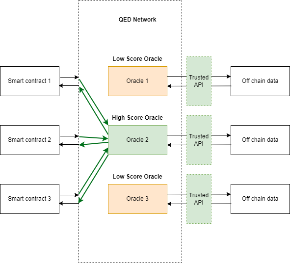 - QED 네트워크는 score 시스템으로 오라클 data의 신뢰성을 검증함.