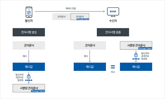 - A는 전자문서를 해시화한 후 개인키로 암호화하여 전달, 전달받은 사람은 A의 공개키로 복호화하여 서명이 위조되지 않았는지 검증