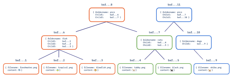 - IPFS는 하나의 시스템("swarm")이고 각 파일이 해시되어 이것이 "filename"이 되는 하나의 파일 시스템입니다. 따라서 두 명의 다른 사람이 추가하는 파일 모음에 있을 수 있는 동일한 파일을 추가하면 해시가 동일한 파일이 충돌합니다.
