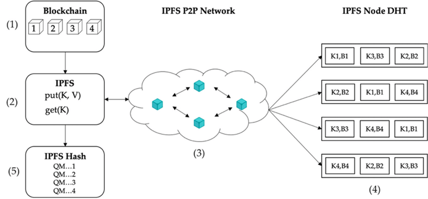 IPFS에서는 기존 HTTP에서 컨텐츠의 위치(IP)를 바탕으로 컨텐츠를 찾는 방식이 아닌, 컨텐츠 자체를 해시 테이블과 매칭하여 ‘content-addressed’된 상태로 각 노드에 분산시켜 저장하고 찾는 방식을 사용.
